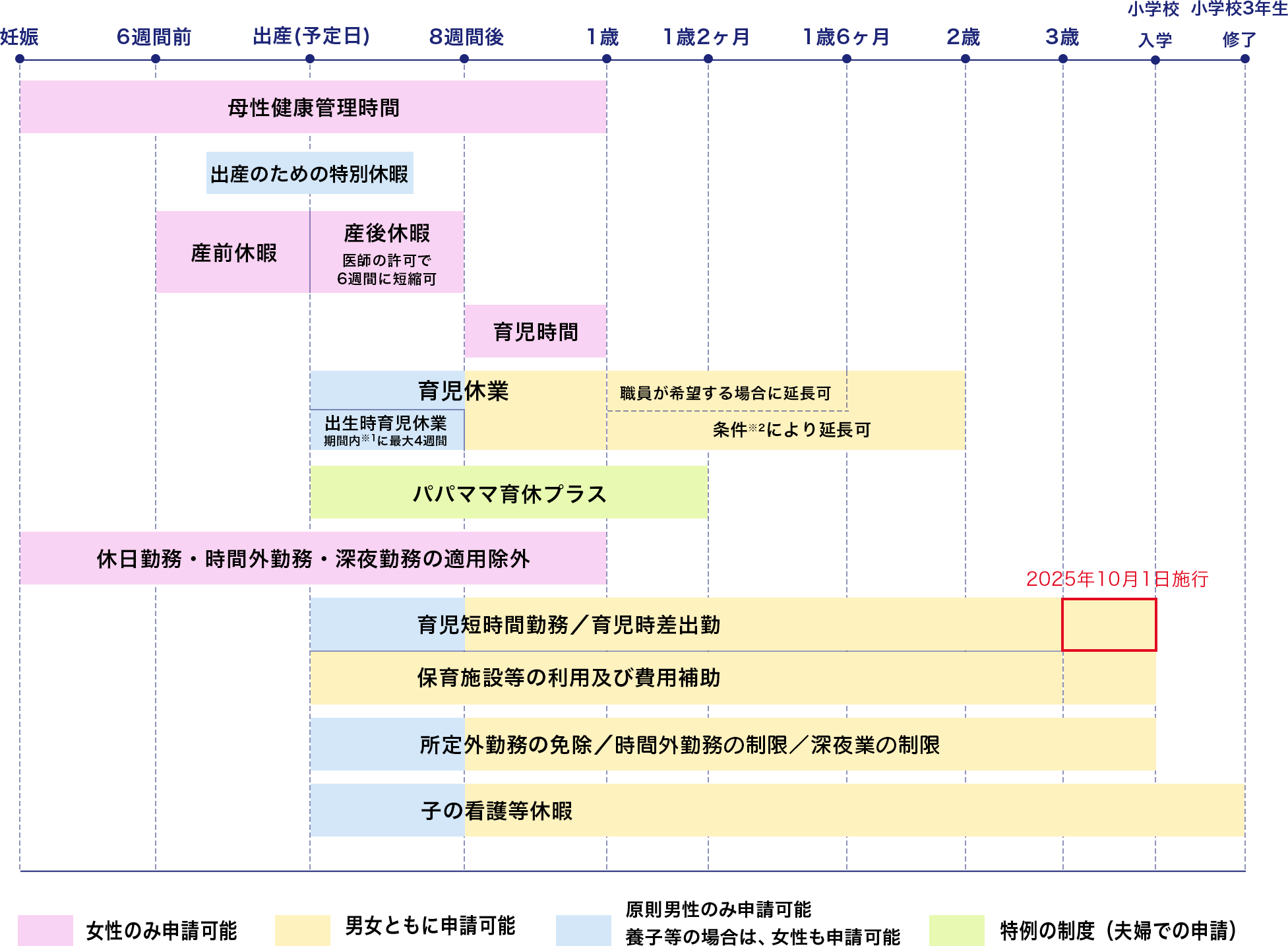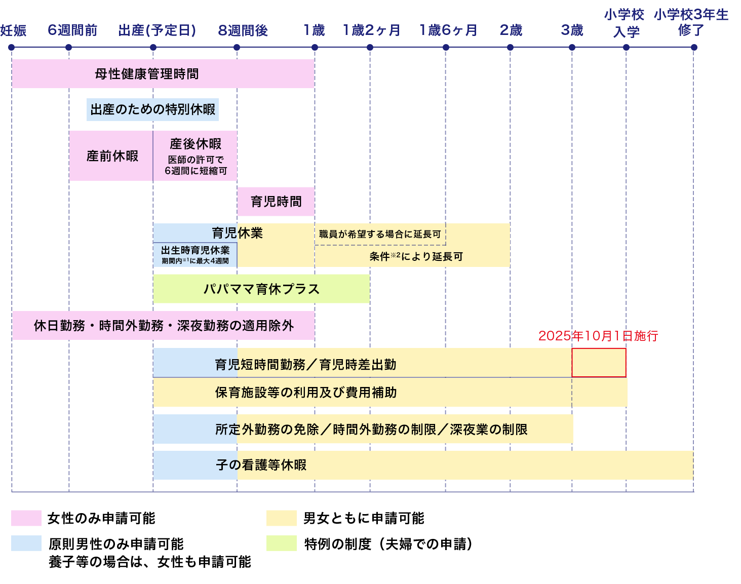 妊娠中及び産後1年の間、休日勤務・時間外勤務・深夜勤務をしない措置を受けることができる。